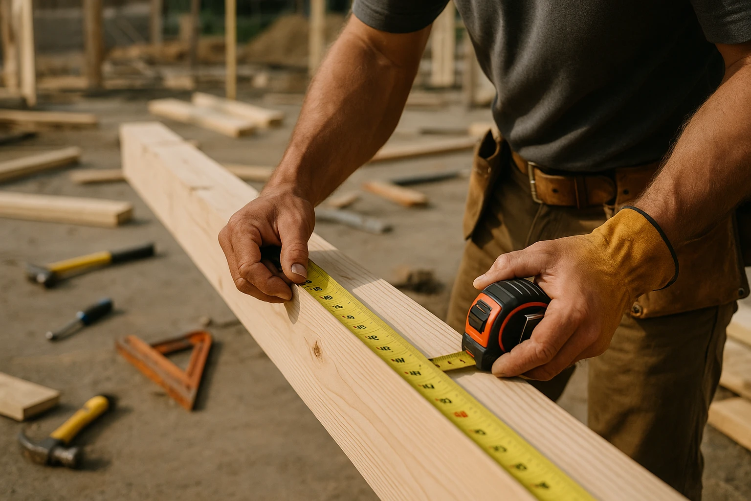 <figcaption style="margin-top: 0.5rem; font-size: 0.9em; color: #666; font-style: italic;">A close-up of a construction worker's hands measuring a wooden beam with a tape measure on a bustling construction site, surrounded by scattered tools and building materials.</figcaption>
