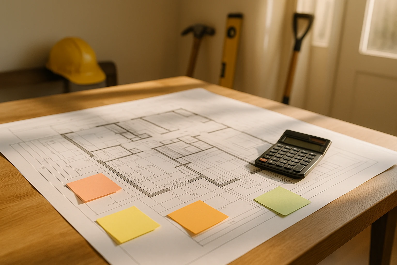 <figcaption style="margin-top: 0.5rem; font-size: 0.9em; color: #666; font-style: italic;">A large blueprint spread across a wooden table, surrounded by color-coded sticky notes and a calculator, in a sunlit room with construction tools leaning against the wall.</figcaption>